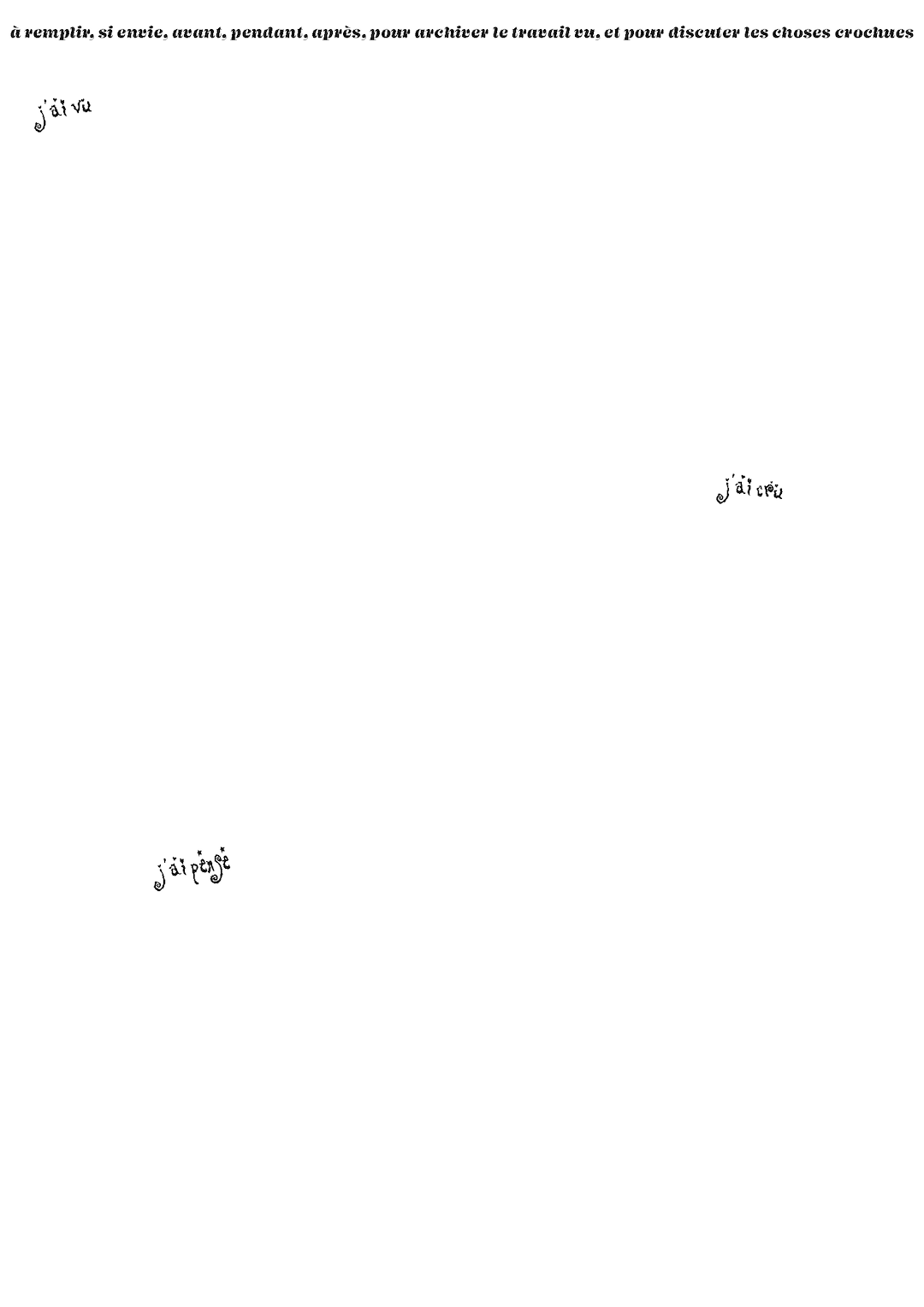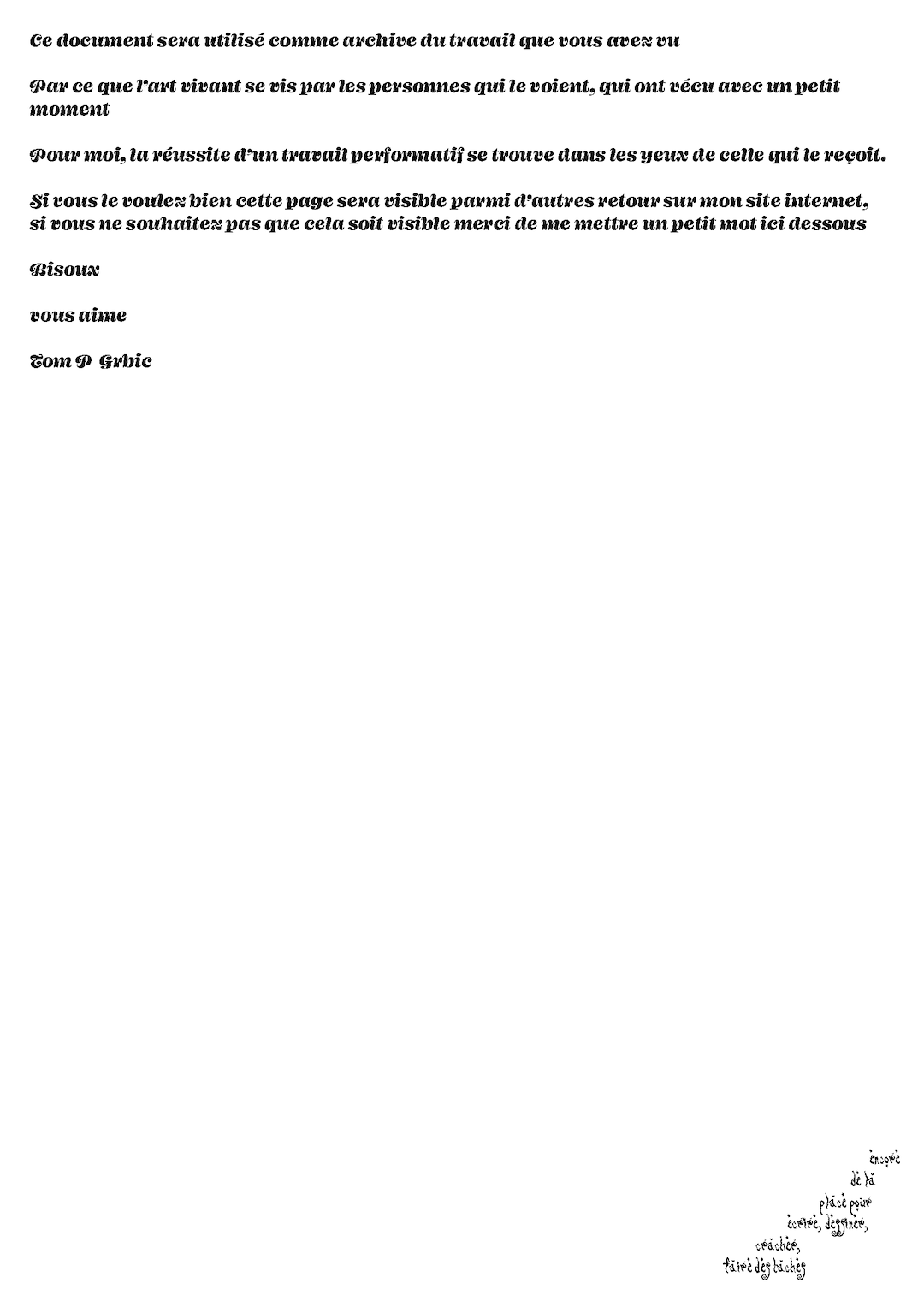 Le but de ce document est de créer une archive du travail qui est co-faite par les personnes qui le voient et l’expérimentent. Il sera utilisé comme archive du travail vu et ressenti. Pour moi la réussite d’un travail est faite par le passage du sous texte, par la compréhension des formes et des mots. Dans l’idée de faire évoluer nos formes et nos fonts ensemble, ces documents permettent d’avoir un retour sur mon travail, d’en créer une archive commune, et une discussion ouverte. Par ce que l’art vivant se vit par les personnes qui le voient, qui ont vécu avec un petit moment Il est disponible depuis janvier 2025, avant, pendant et après mes performances, peut être remplis pendant après, bien après, rendu, dessiné, photographié, pardonné, lu ou pas.